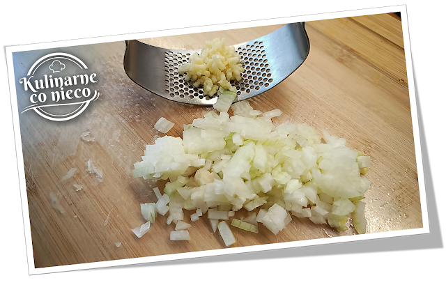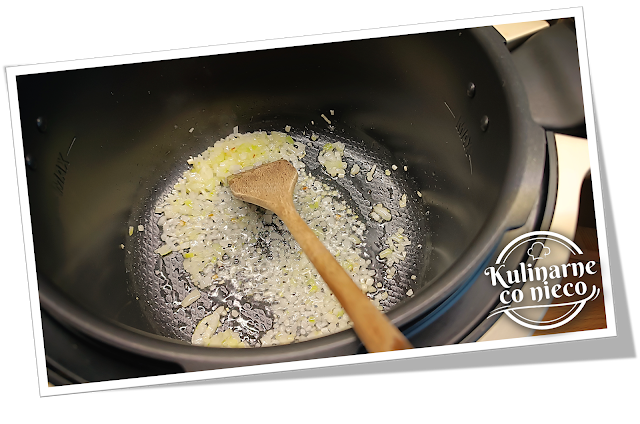 Uruchomić program ,,ŚREDNIE PODSMAŻANIE”. Do misy wlać oliwę, poczekać aż się rozgrzeje a następnie dodać posiekaną cebulę i 2 przeciśnięte przez praskę ząbki czosnku. Całość smażyć około 2–3 minut, aż cebula i czosnek staną się szkliste i aromatyczne.