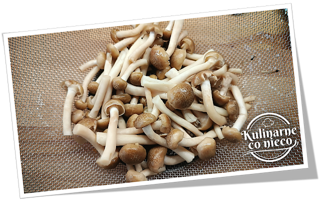 Grzybki shimeji oddzielić od twardej, wspólnej podstawy – odciąć dolną część korzeniową a pozostałe główki delikatnie rozdzielić palcami na mniejsze kępki lub pojedyncze grzybki. Umyć pod bieżącą wodą i dokładnie osuszyć w papierowym ręczniku lub na sicie.