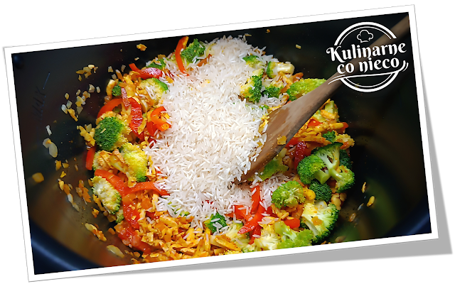 ryż basmati, rozprowadzić równomiernie po dnie – nie płukać go wcześniej, aby