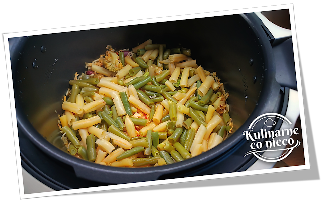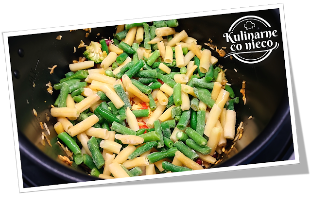 ułożyć fasolkę szparagową — nie mieszać jej z resztą składników, tylko pozwolić