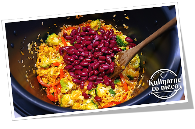 bulionu. Dodać odsączoną i przepłukaną czerwoną fasolę, rozprowadzając ją