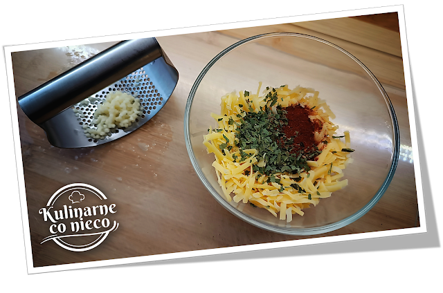 rozłożyć przygotowaną wcześniej mieszankę cheddara z czosnkiem, papryką i