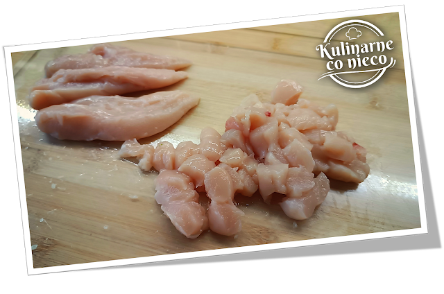 kurczaka oczyścić z błon i pokroić w równą kostkę o boku około 1½ cm.