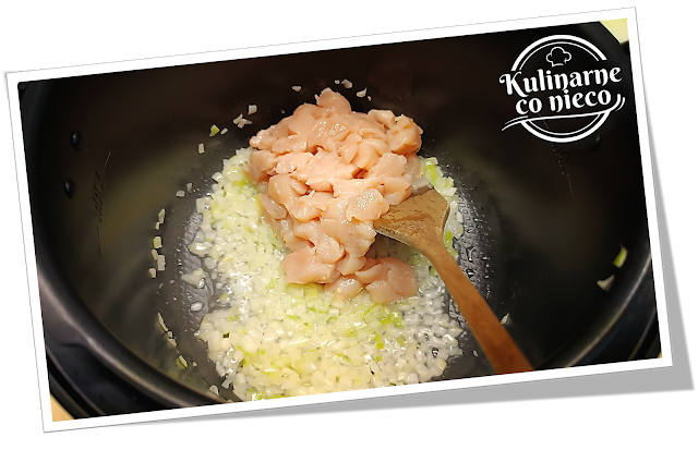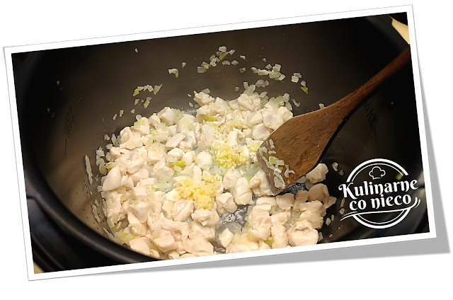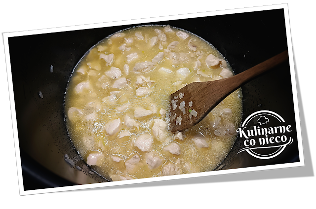 pokrojonego w kostkę kurczaka, oprószyć solą, pieprzem i smażyć ok 3 minuty,