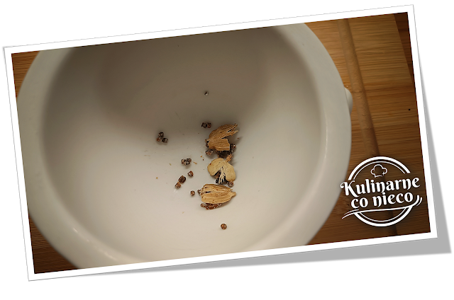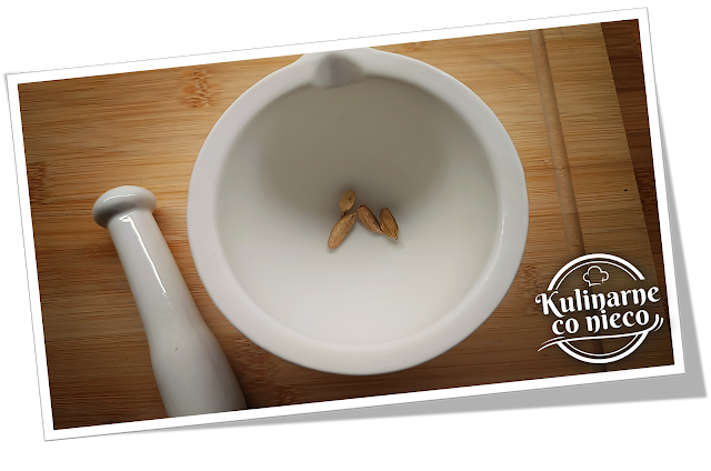 kardamonu rozgnieść w moździerzu, dociskając je delikatnie tłuczkiem jedynie do