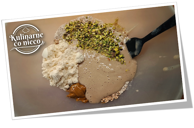 oraz pastę pistacjową, która nada masie aromat i delikatnie zielonkawy odcień.