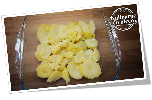 Na spodzie ułożyć ½ porcji ziemniaków w jednej warstwie.