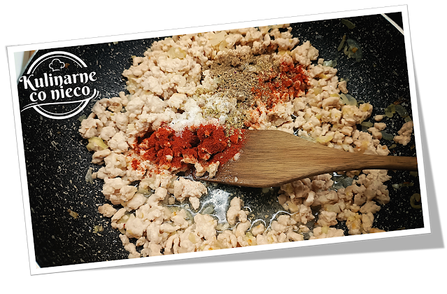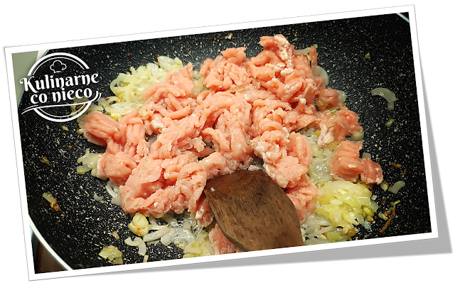 szklista, bez rumienienia. Dodać mielone mięso z indyka i smażyć, rozdrabniając