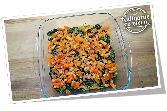 równomiernie rozłożyć szpinak, następnie paprykę i kukurydzę.