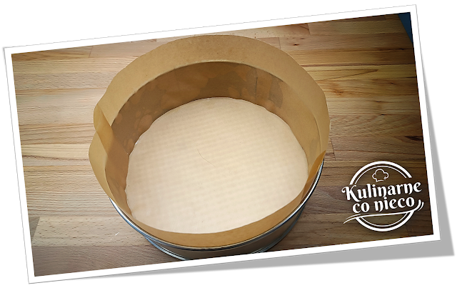 rozgrzać do 170°C (górna/dolna grzałka). Tortownicę o Ø20 cm wyłożyć papierem