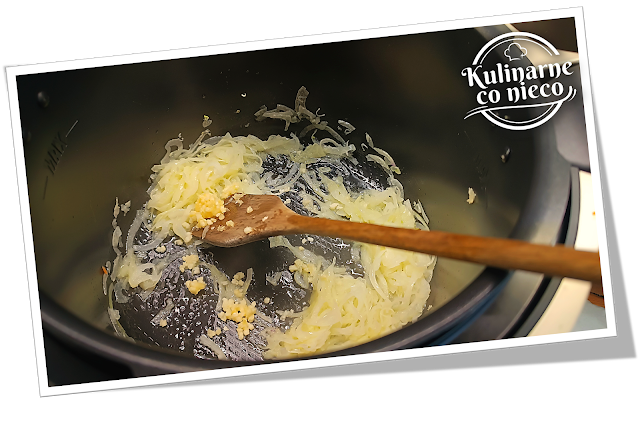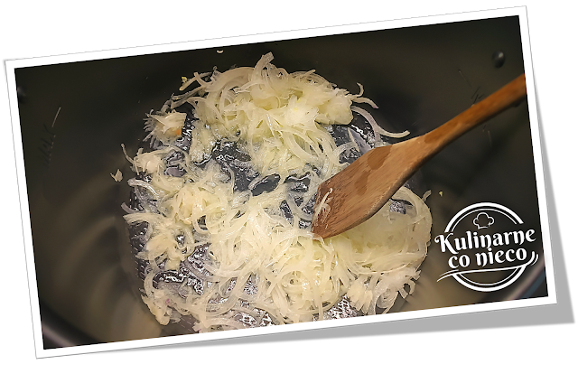 Uruchomić program ,,ŚREDNIE PODSMAŻANIE”. Do misy wlać oliwę, poczekać aż się rozgrzeje a następnie dodać cebulę i smażyć przez około 2–3 minuty, aż stanie się miękka i szklista, nie dopuszczając do jej zrumienienia.