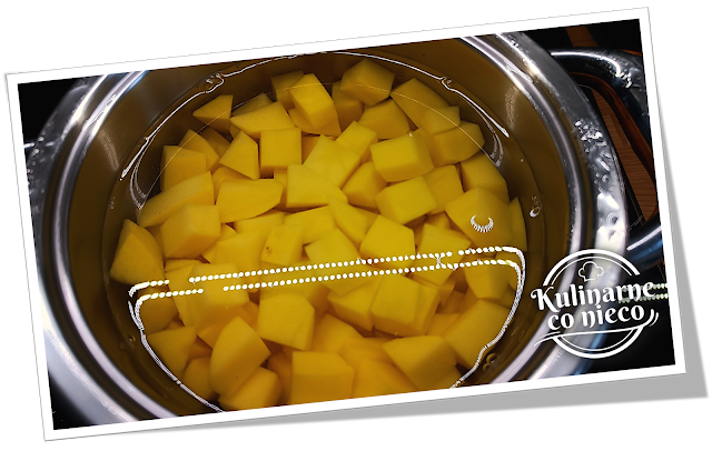 Ziemniaki obrać i pokroić w równą, średnią kostkę tak, aby po ugotowaniu zachowały kształt i nie rozpadły się w trakcie mieszania.