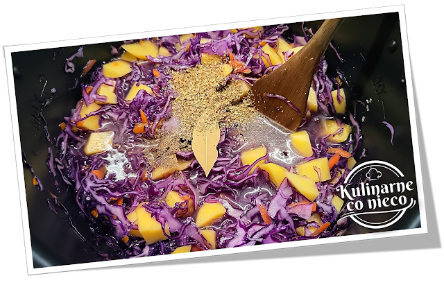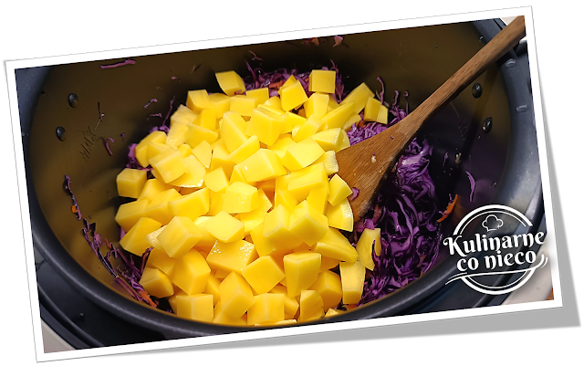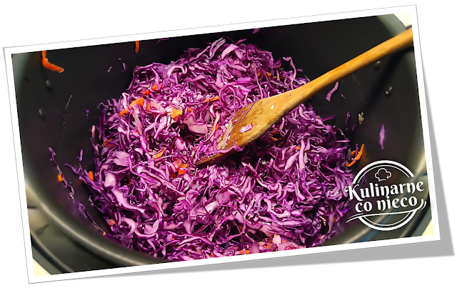 Do podsmażonych warzyw dodać poszatkowaną czerwoną kapustę i dokładnie wymieszać, tak aby została równomiernie pokryta aromatyczną bazą. Podgrzewać kilka minut, aż kapusta lekko zwiędnie i zmniejszy objętość.