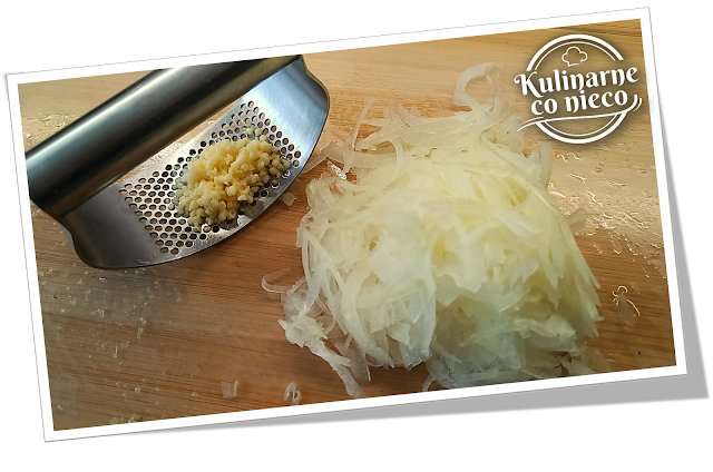 Cebulę drobno posiekać a czosnek przecisnąć przez praskę.
