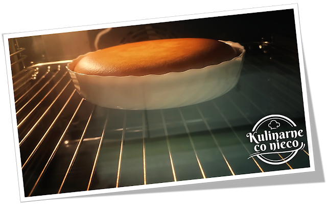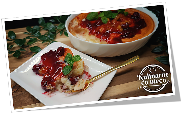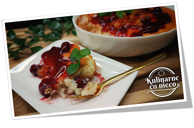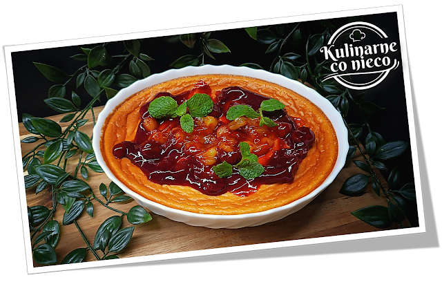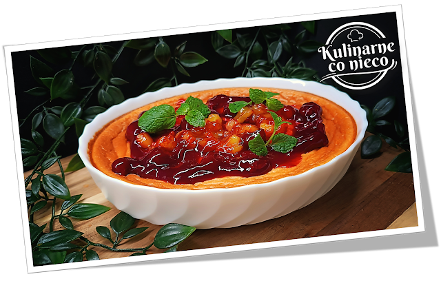 Po upieczeniu zachwyca delikatnością i aksamitną strukturą. Wierzch jest subtelnie złocisty i sprężysty a środek miękki, wilgotny i kremowy, jak połączenie budyniu z lekkim sufletowym deserem. Smak pozostaje czysty, mleczno-waniliowy, nienachalny, dzięki czemu doskonale komponuje się z owocową frużeliną, która wnosi świeżość i naturalną kwaskowatość. To słodycz, która nie męczy, nie przytłacza nadmiarem cukru, nie zostawia uczucia ciężkości, lecz daje przyjemne ciepło i satysfakcję, jaką pamięta się z domowych stołów.