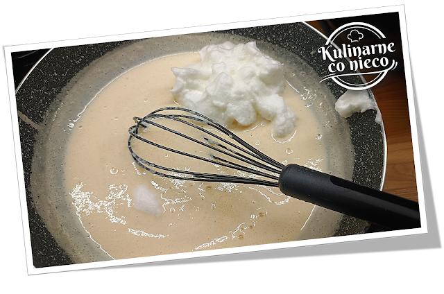 Do masy w garnku dodać najpierw niewielką część piany i delikatnie wymieszać, aby rozluźnić masę. Następnie dodać resztę piany w 2 turach i połączyć szpatułką ruchem od dołu do góry, tak aby nie zniszczyć napowietrzenia. Gotowa masa powinna być wyraźnie lżejsza, puszysta i nadal nalewna.