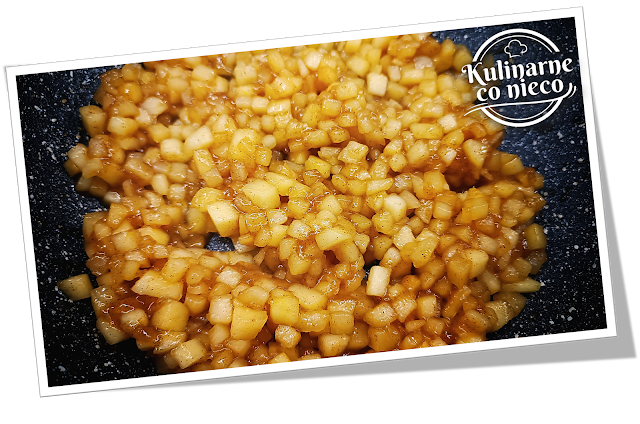 Podgrzewać na średnim ogniu przez około 7 minut, mieszając od czasu do czasu, aż jabłka wyraźnie zmiękną, puszczą sok i zaczną nabierać lekko szklistego wyglądu. Nie należy doprowadzać do ich rozpadania się, ponieważ farsz powinien zachować wyczuwalne kawałki owoców.