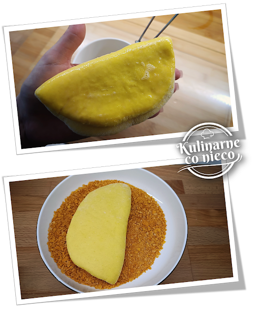kukurydzianych, tak aby płatki równomiernie przykleiły się do powierzchni. Opanierowane