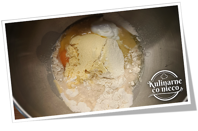 misy miksera wsypać mąkę pszenną, orkiszową, kukurydzianą, drożdże, kurkumę