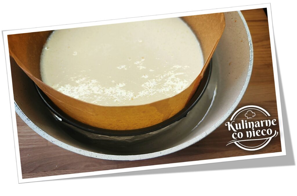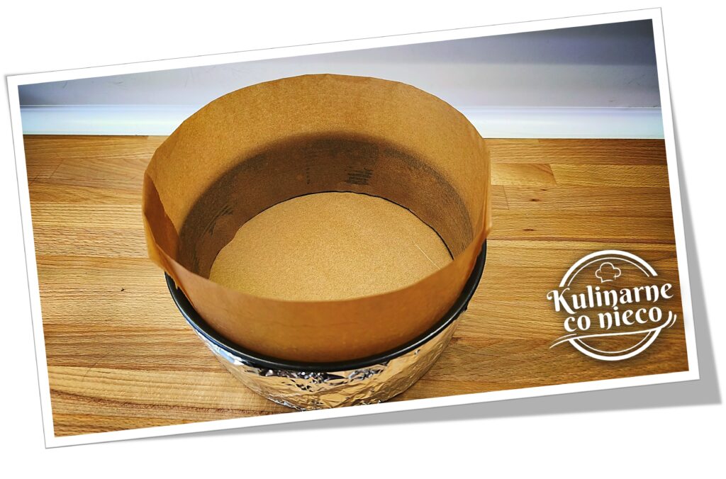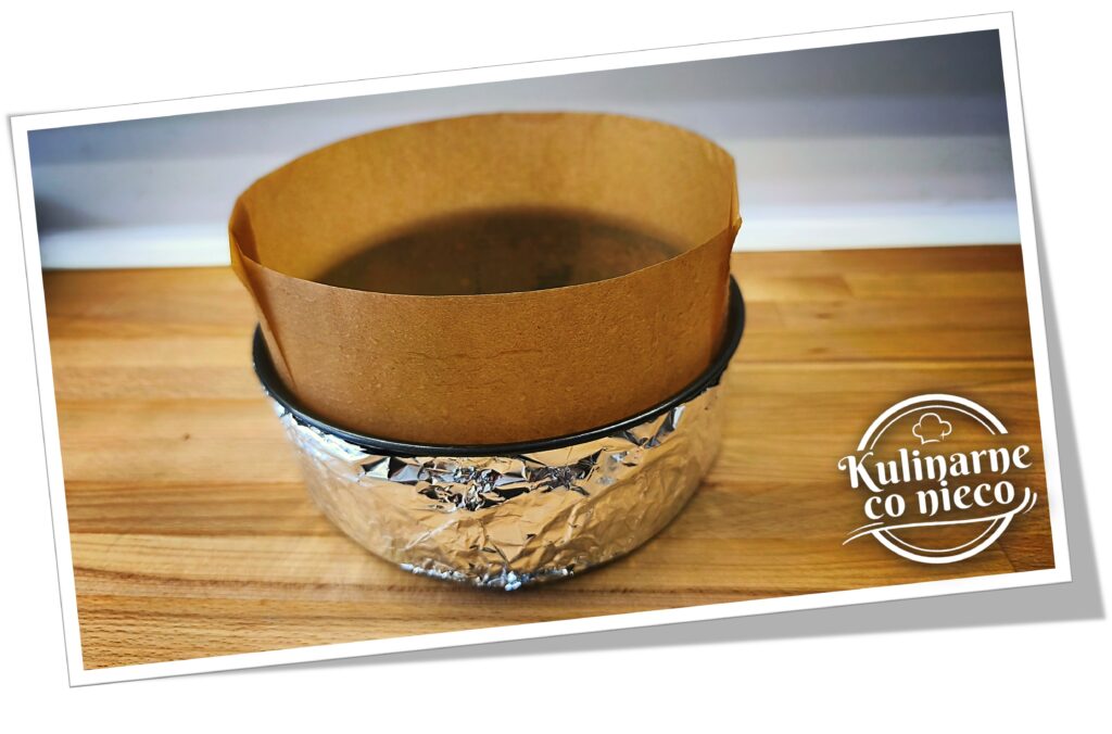 Spód formy owinąć dokładnie folią aluminiową, co zabezpieczy ciasto przed dostaniem się wody podczas pieczenia w kąpieli wodnej.