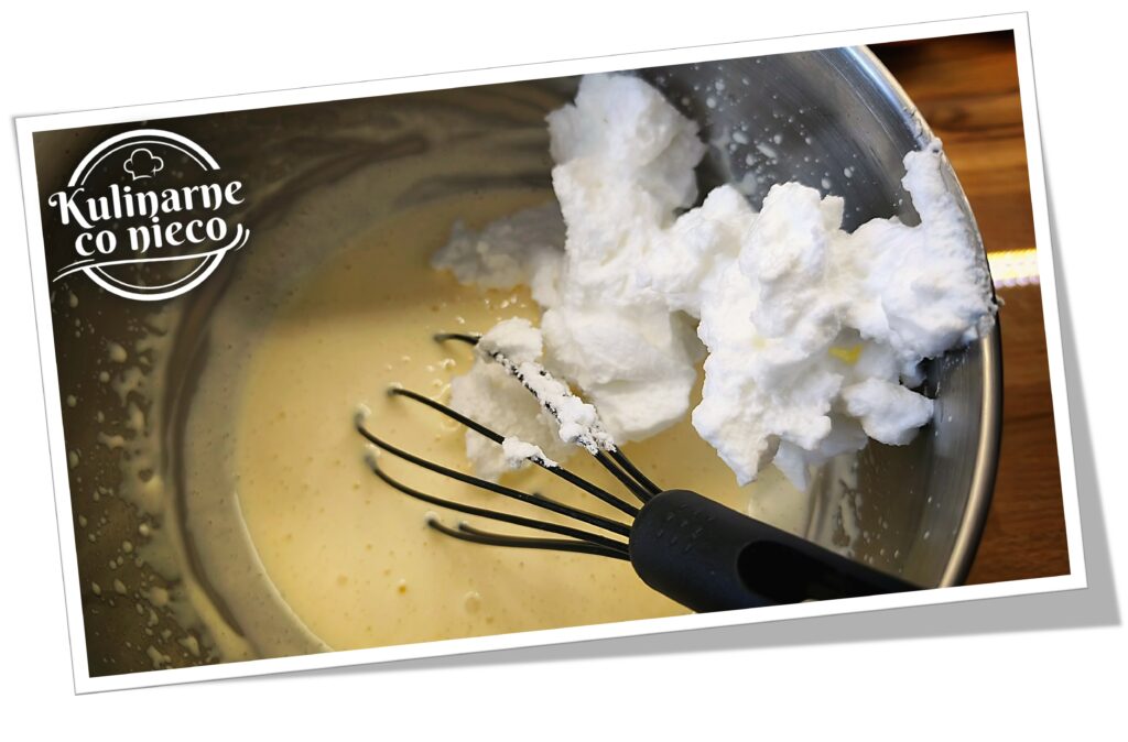 Do przygotowanej masy skyrnikowej dodać około ⅓ ubitych białek i delikatnie wymieszać, aby rozluźnić strukturę. Następnie dodać pozostałą pianę w dwóch turach, za każdym razem mieszając bardzo delikatnie łopatką, wykonując ruchy od dołu do góry, aby nie zniszczyć napowietrzenia masy. Na tym etapie nie należy się spieszyć, ponieważ to właśnie piana odpowiada za puszystość i lekkość ciasta.