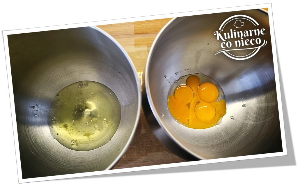 Oddzielić białka od żółtek, zwracając uwagę, aby do białek nie dostała się ani odrobina żółtka, ponieważ utrudni to ich późniejsze ubicie. Jajka powinny mieć temperaturę pokojową, dzięki czemu masa lepiej się połączy i będzie bardziej stabilna.
