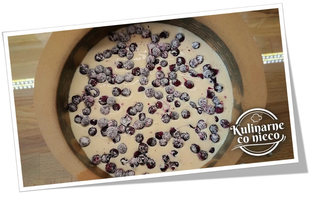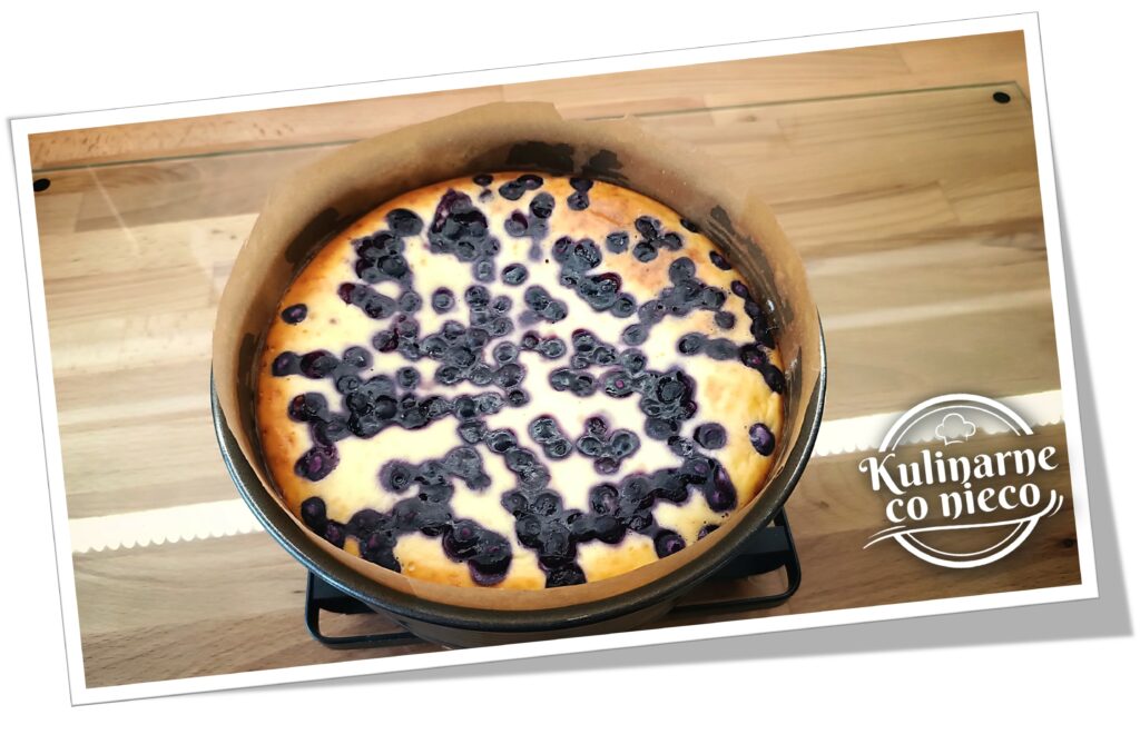 Jagód nie rozmrażać. Dzięki temu owoce zachowają kształt i nie puszczą nadmiaru soku. Bezpośrednio przed wyłożeniem na wierzch skyrnika przełożyć mrożone jagody do miseczki i wymieszać je z około jedną łyżką skrobi ziemniaczanej. Skrobia wchłonie nadmiar wilgoci, dzięki czemu owoce nie zabarwią całej powierzchni skyrnika i nie utworzą wodnistych plam podczas pieczenia. Tak przygotowane jagody rozsypać równomiernie na wierzchu masy i bardzo delikatnie wcisnąć je w powierzchnię, aby częściowo zanurzyły się w cieście i ładnie prezentowały się również po przekrojeniu.