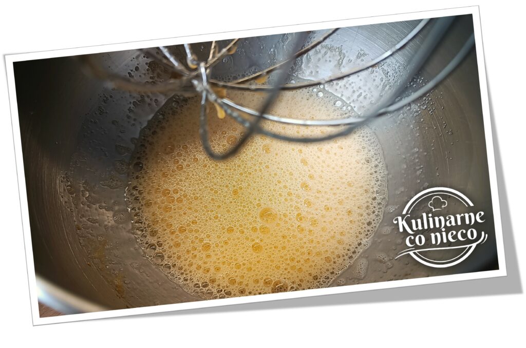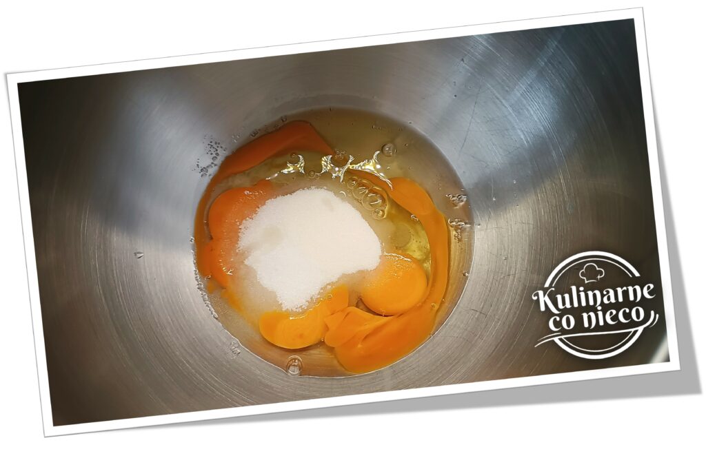 Do większej miski wbić jajka, dodać erytrytol i krótko wymieszać trzepaczką lub mikserem na niskich obrotach. Nie należy ubijać jajek na puszystą pianę – wystarczy jedynie połączyć składniki tak, aby masa była jednolita. Zbyt intensywne napowietrzenie mogłoby spowodować późniejsze pęknięcia lub nadmierne opadnięcie skyrnika po upieczeniu.