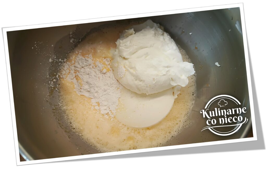 Do masy jajecznej dodać odsączony skyr, ricottę, proszek budyniowy, ekstrakt lub cukier waniliowy oraz szczyptę soli. Całość zblendować blenderem ręcznym lub mikserem lub dokładnie wymieszać, aż powstanie gładka, jednolita masa bez grudek. Nie trzeba mieszać jej długo – wystarczy moment, w którym wszystkie składniki dobrze się połączą.