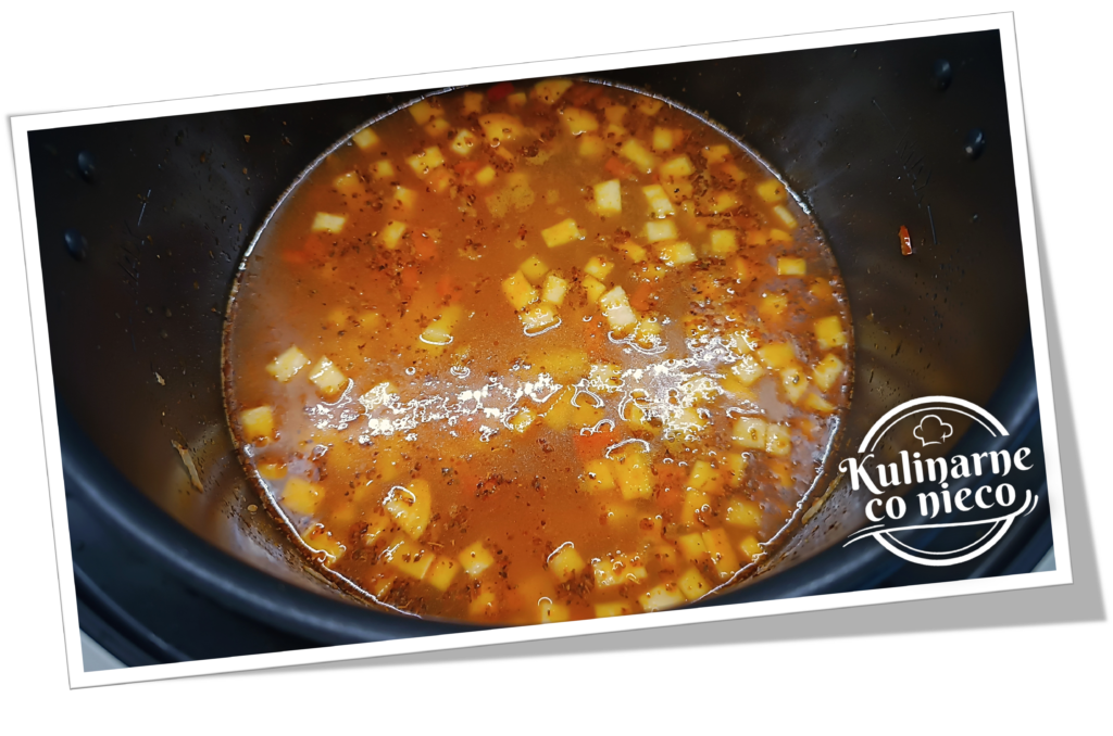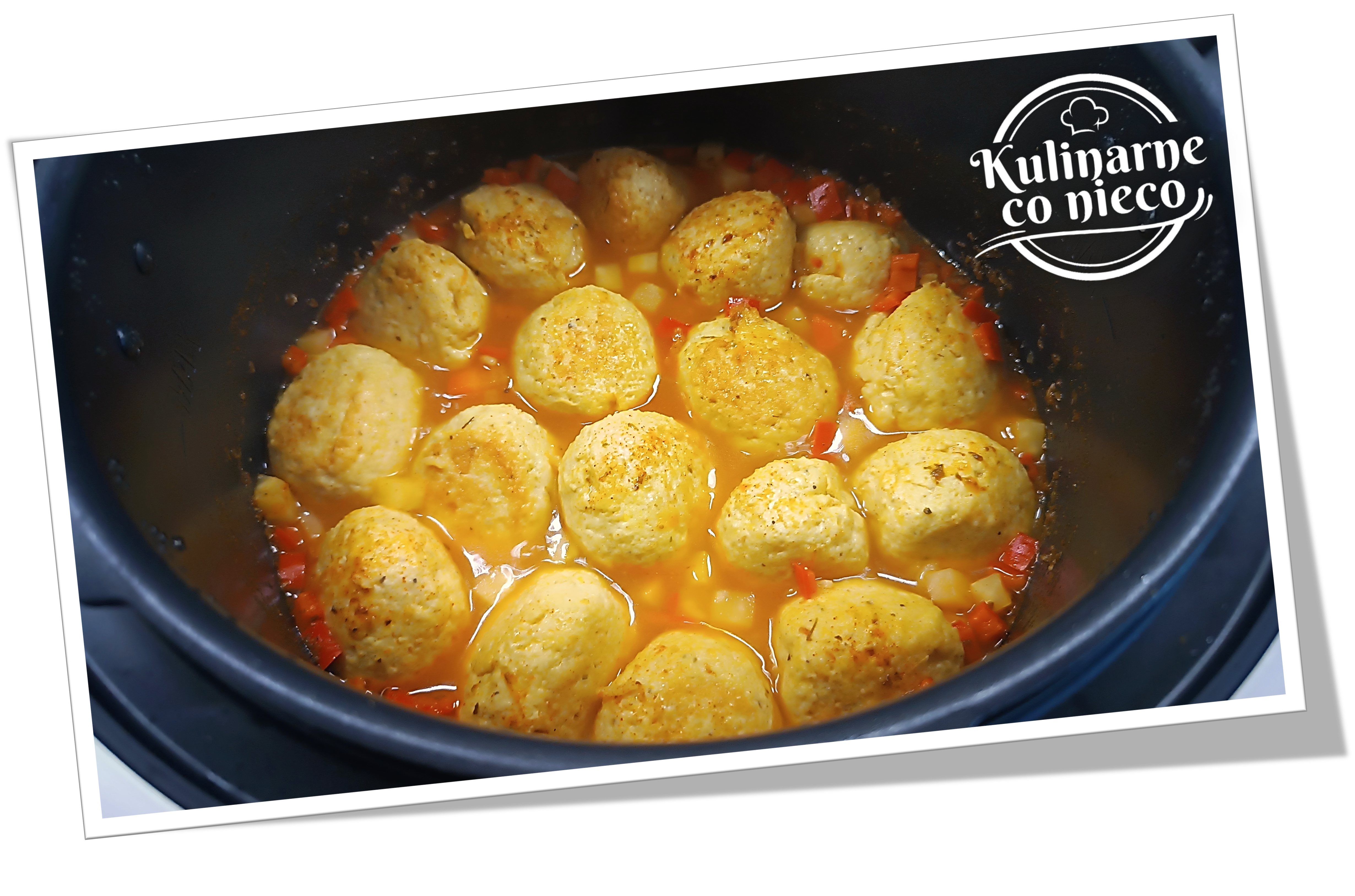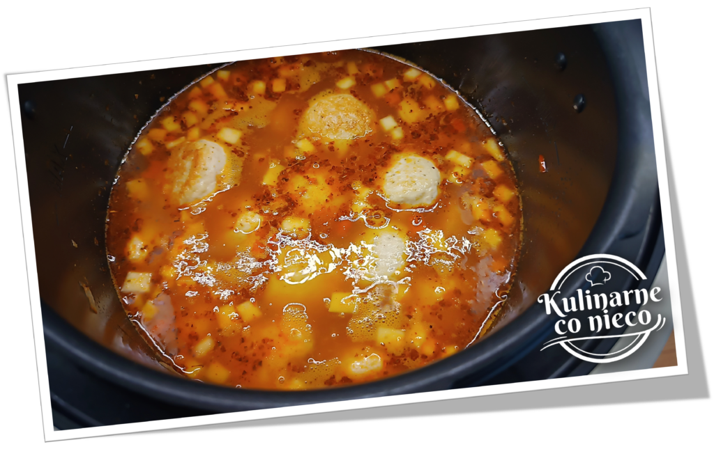 Do garnka wlać gorący bulion warzywny lub drobiowy i dodać ziemniaki. Delikatnie włożyć wcześniej obsmażone pulpeciki, starając się ich nie mieszać intensywnie, aby nie uszkodzić ich struktury.