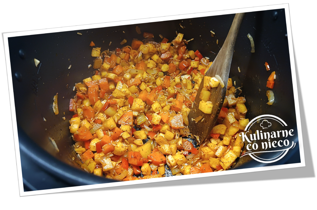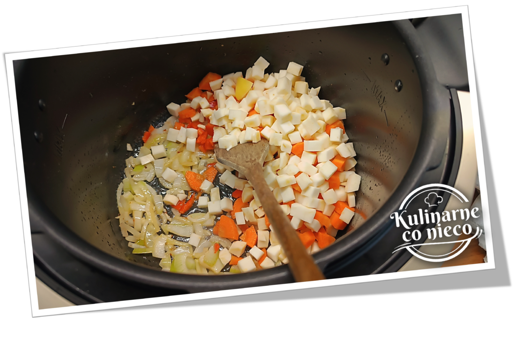 Następnie dodać marchew, pietruszkę, seler korzeniowy oraz czerwoną paprykę. Całość smażyć przez dwie do trzech minut, mieszając, aby warzywa lekko się podsmażyły i zaczęły oddawać swój naturalny smak. Dodać majeranek i słodką papryke.