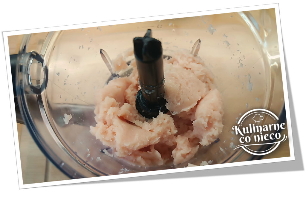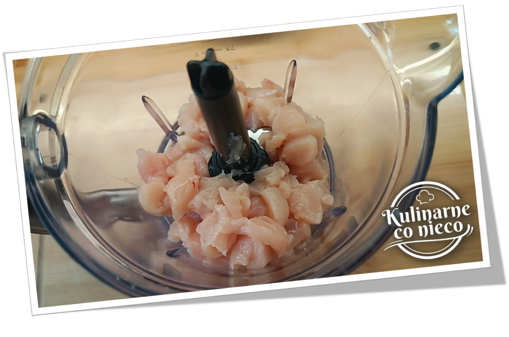 Polędwiczki z kurczaka pokroić na mniejsze kawałki, aby blender mógł je równomiernie rozdrobnić. Przełożyć mięso do kielicha blendera wyposażonego w podwójne ostrze typu „S”.