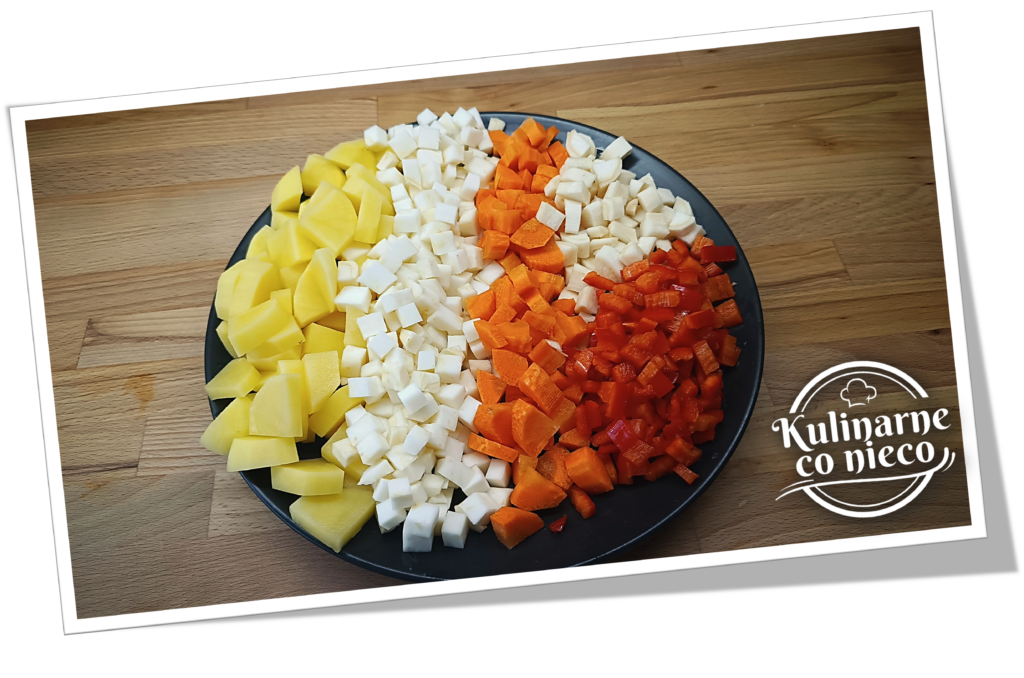 Marchew, pietruszkę i seler obrać i pokroić w niewielką kostkę.