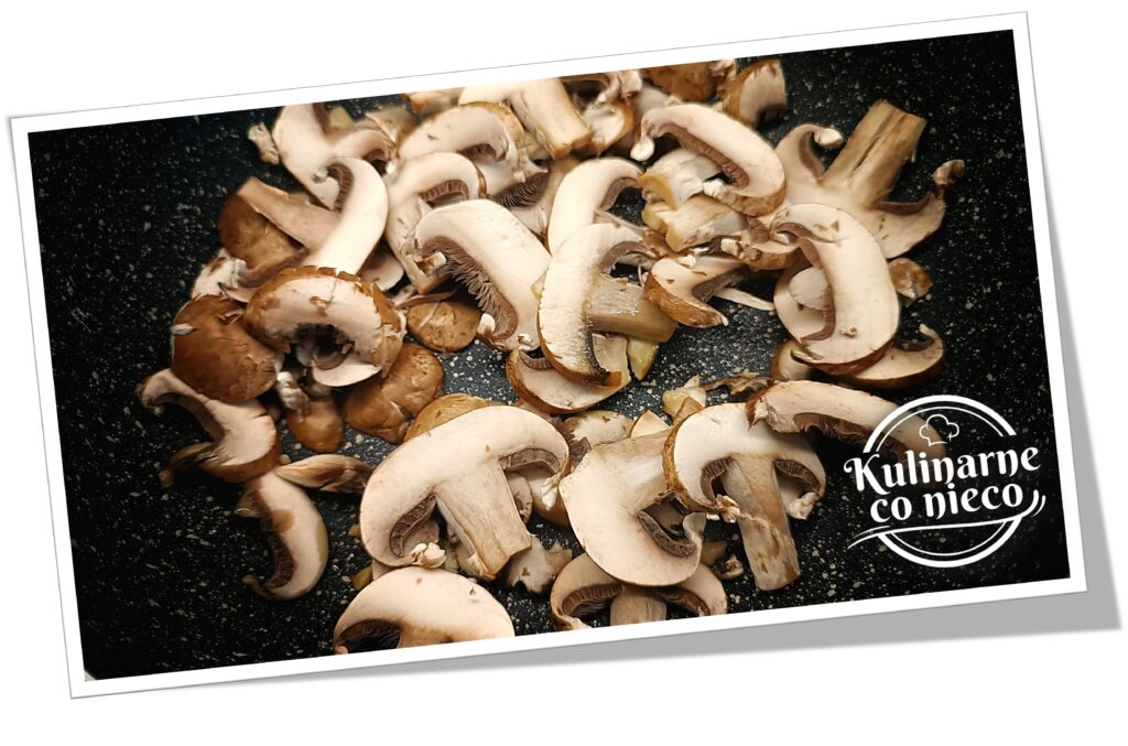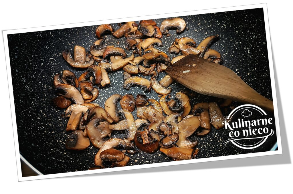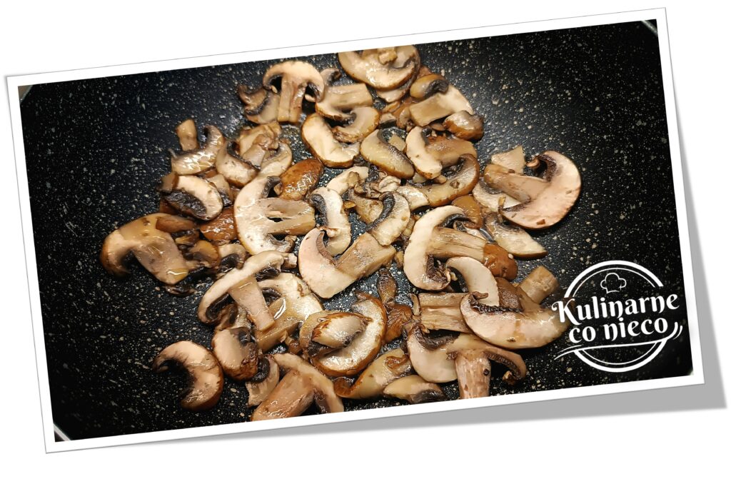Na patelni rozgrzać niewielką ilość oleju i smażyć pieczarki na średnio wysokim ogniu. Na początku puszczą wodę – należy pozwolić jej odparować, a następnie smażyć dalej, aż nabiorą złotobrązowego koloru. Pod koniec doprawić je solą i pieprzem. Gotowe pieczarki odstawić na bok.