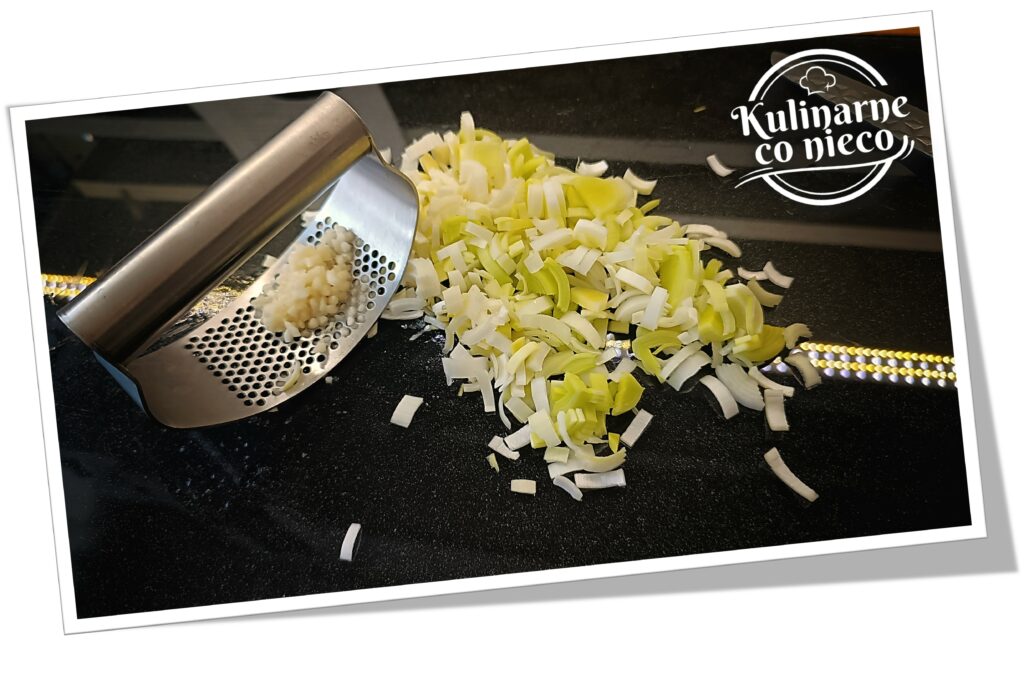 Biała część pora oczyścić i drobno pokroić. Czosnek obrać i przecisnąć przez praskę.