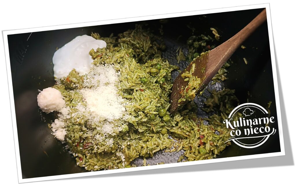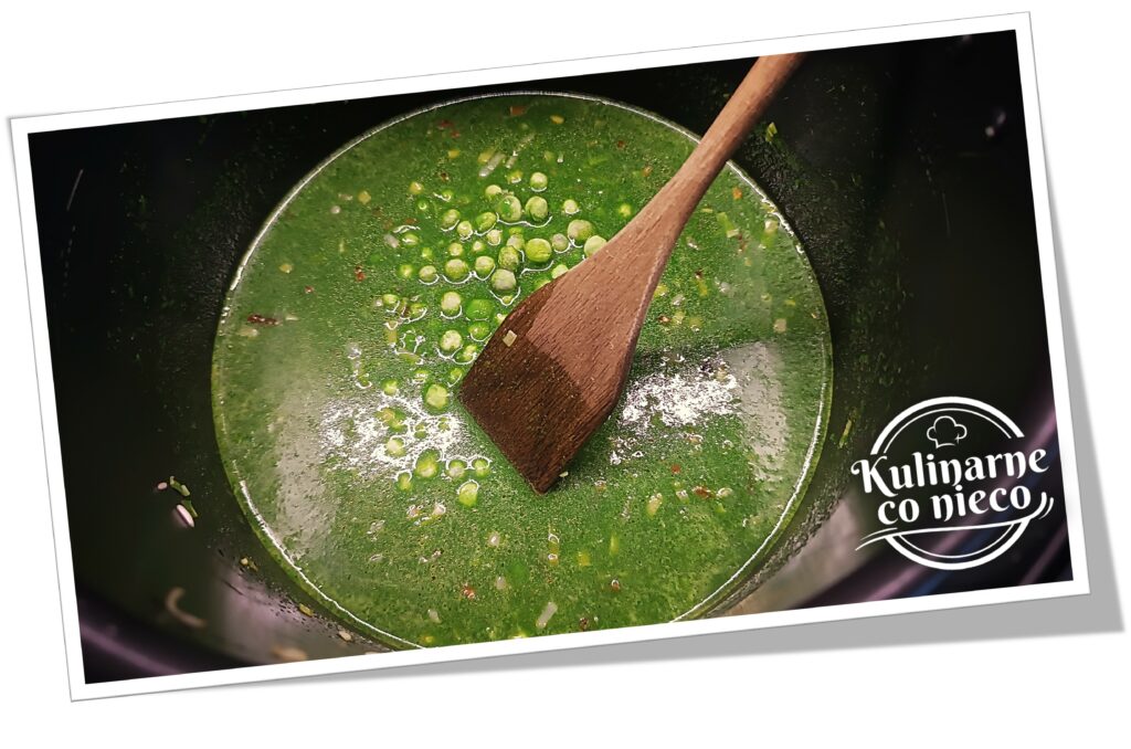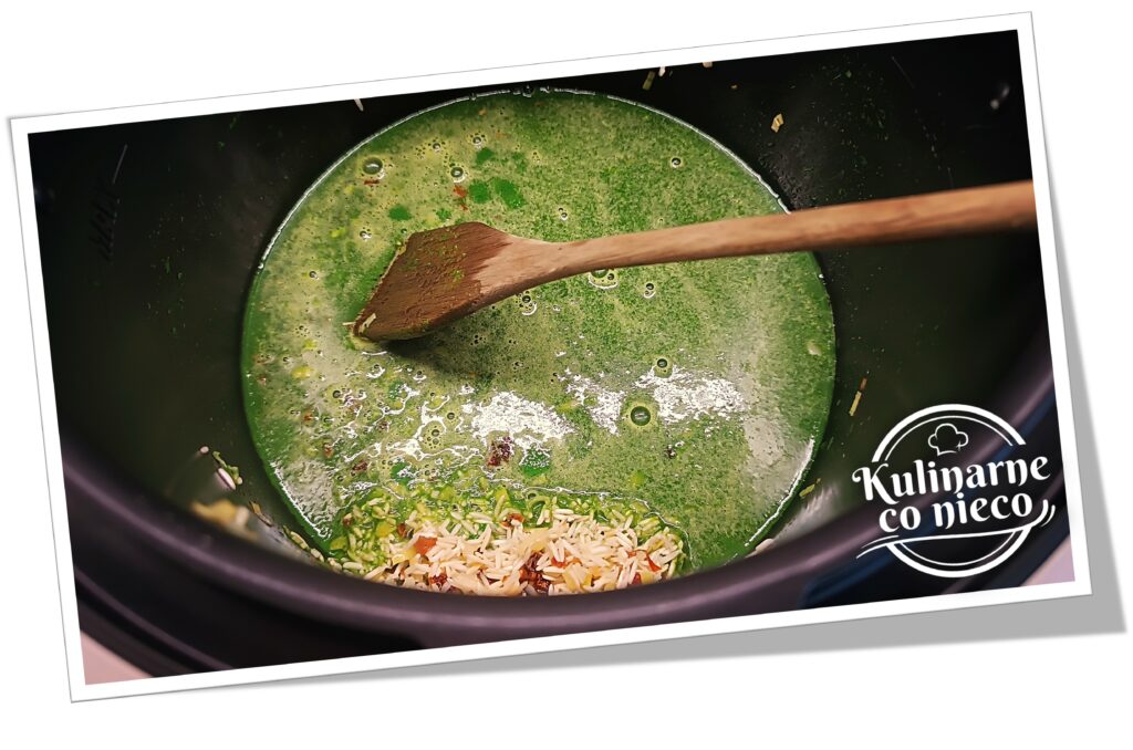 Do ryżu wlać zmiksowany zielony bulion ze szpinakiem i mrożony groszek, dokładnie wymieszać.