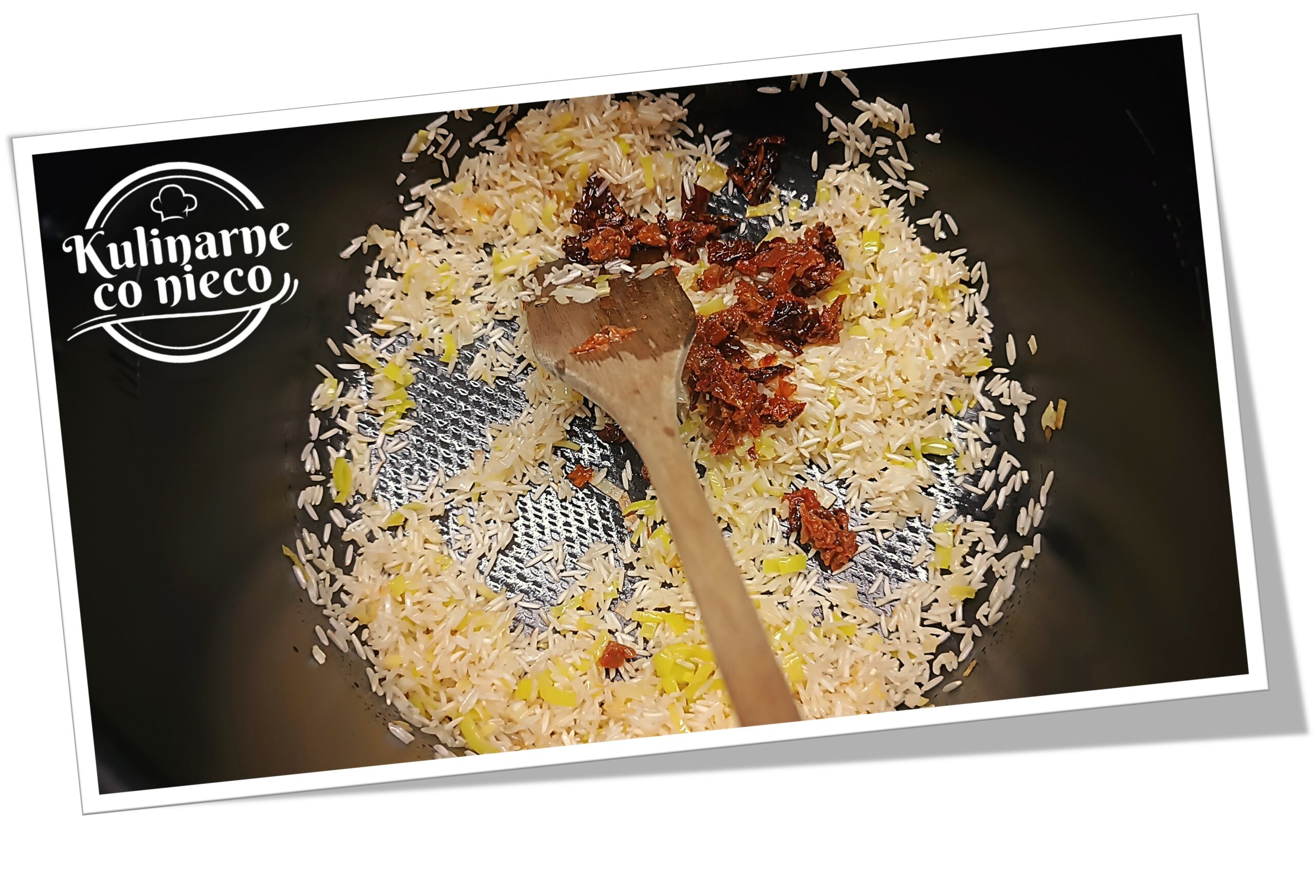 Wsypać suchy ryż basmati i smażyć przez około minutę, mieszając, aż ziarna lekko się zeszklą. Ten etap sprawia, że ryż zachowuje strukturę i nie rozgotowuje się podczas dalszego gotowania. Dodać pokrojone suszone pomidory i wymieszać.