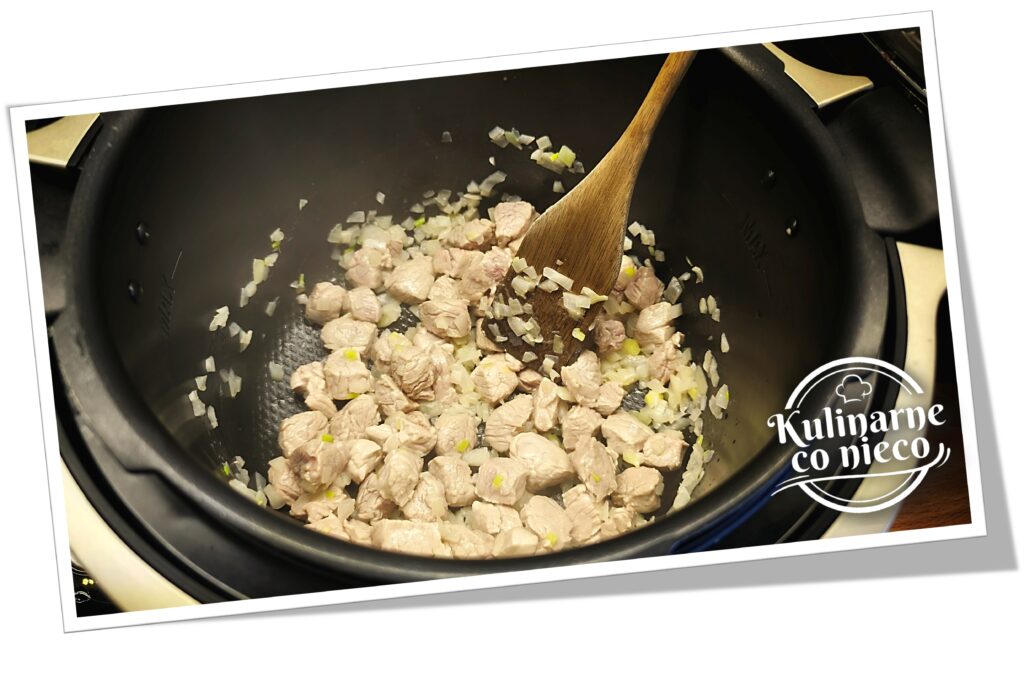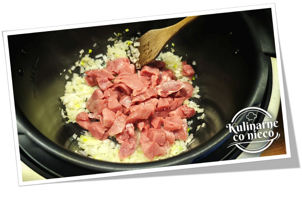 Dodać pokrojoną polędwiczkę i smażyć, mieszając, aż mięso lekko się zarumieni i zamknie z zewnątrz.