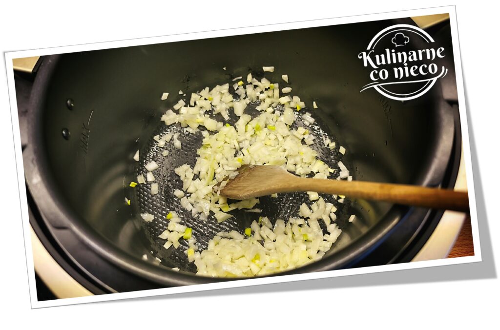 Uruchomić program ,,ŚREDNIE PODSMAŻANIE”. Wlać łyżkę oliwy z oliwek, dodać cebulę i smażyć przez 2–3 minuty, aż się zeszkli i lekko zmięknie. Następnie dodać czosnek i chwilę podsmażyć, tylko do momentu aż zacznie wydzielać aromat.