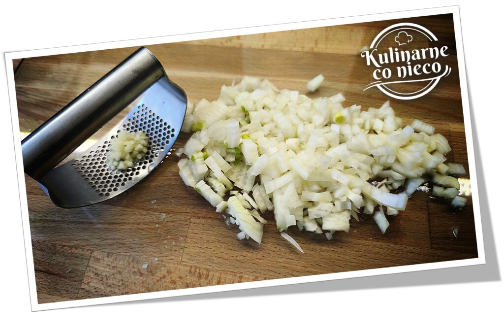 Cebulę obrać i pokroić w drobną kostkę. Czosnek obrać i przecisnąć przez praskę lub bardzo drobno posiekać.