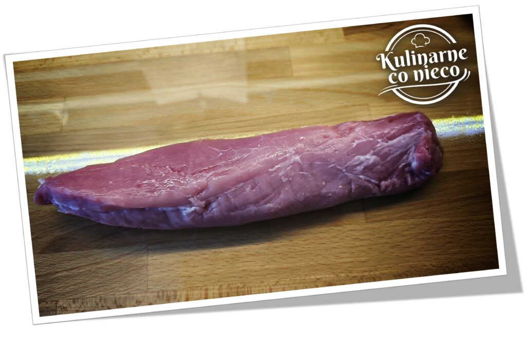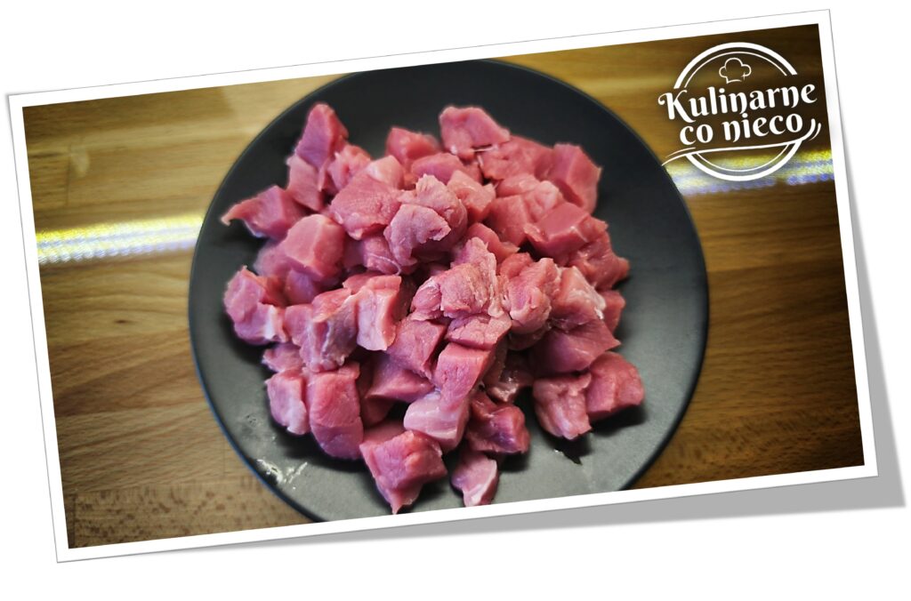Polędwiczkę wieprzową oczyścić z ewentualnych błon i nadmiaru tłuszczu, następnie pokroić w niewielką, równą kostkę o wielkości ok 1½ cm.