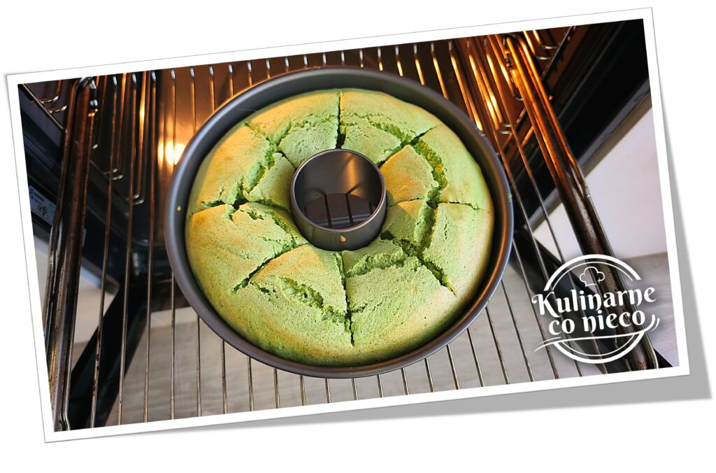 Po upieczeniu wyjąć ciasto z piekarnika i natychmiast odwrócić formę do góry dnem, opierając komin na szklance lub stabilnym naczyniu lub na nóżkach, jeśli używana jest typowa forma do ciast szyfonowych.