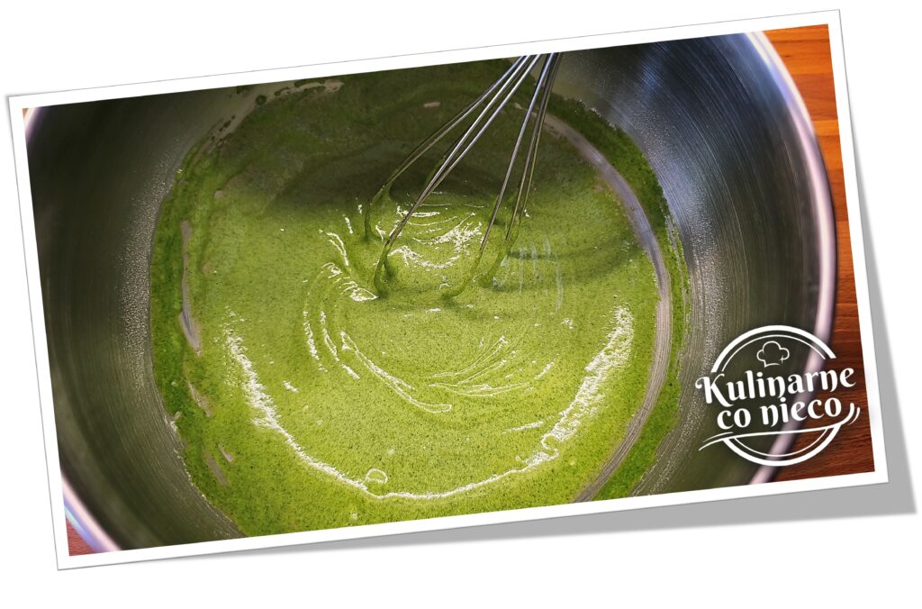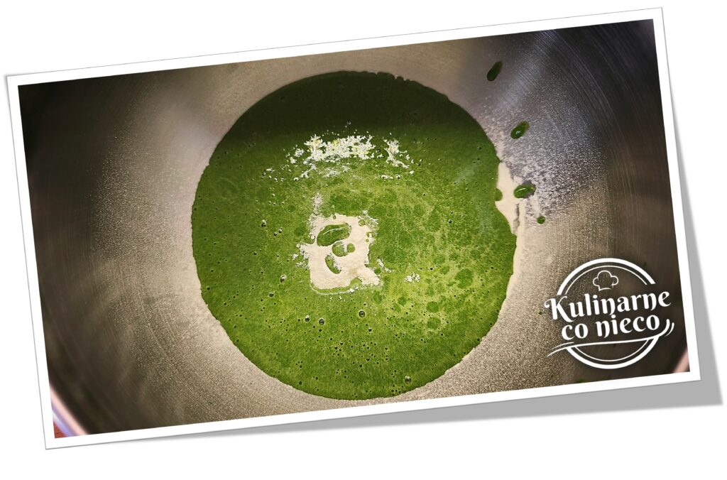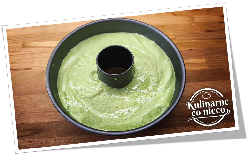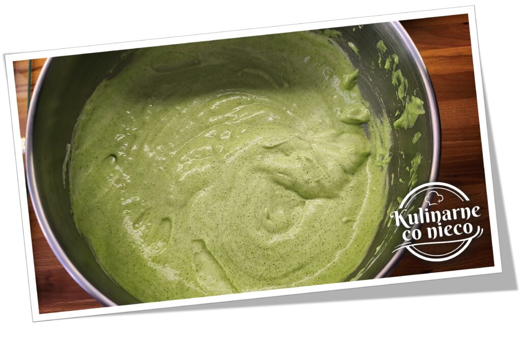 Szpinak rozmrozić i bardzo dokładnie odcisnąć z nadmiaru wody, najlepiej w dłoniach lub przez ściereczkę, tak aby pozostała możliwie sucha masa. To bardzo ważny etap, ponieważ nadmiar wilgoci może wpłynąć na strukturę ciasta i sprawić, że będzie niższe. Tak przygotowany szpinak przełożyć do blendera kielichowego, dodać mleko, żółtka, olej, erytrytol, cukier oraz aromat. Całość zmiksować na jednolitą, gładką i lekko puszystą masę o konsystencji musu. Masa powinna być całkowicie pozbawiona grudek i mieć równomierny, intensywnie zielony kolor.