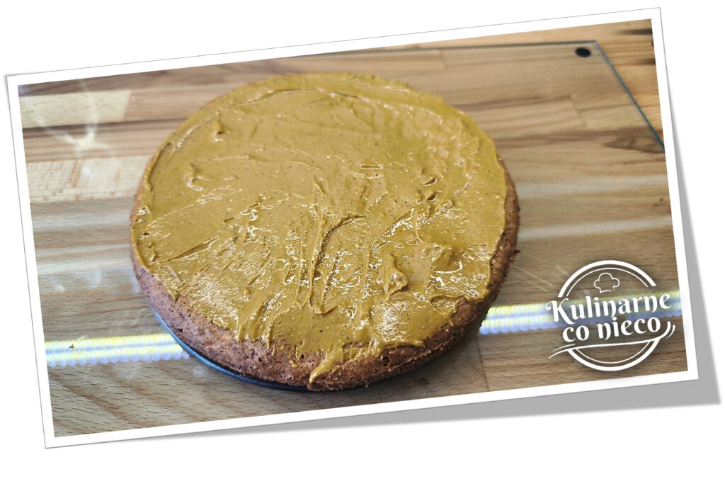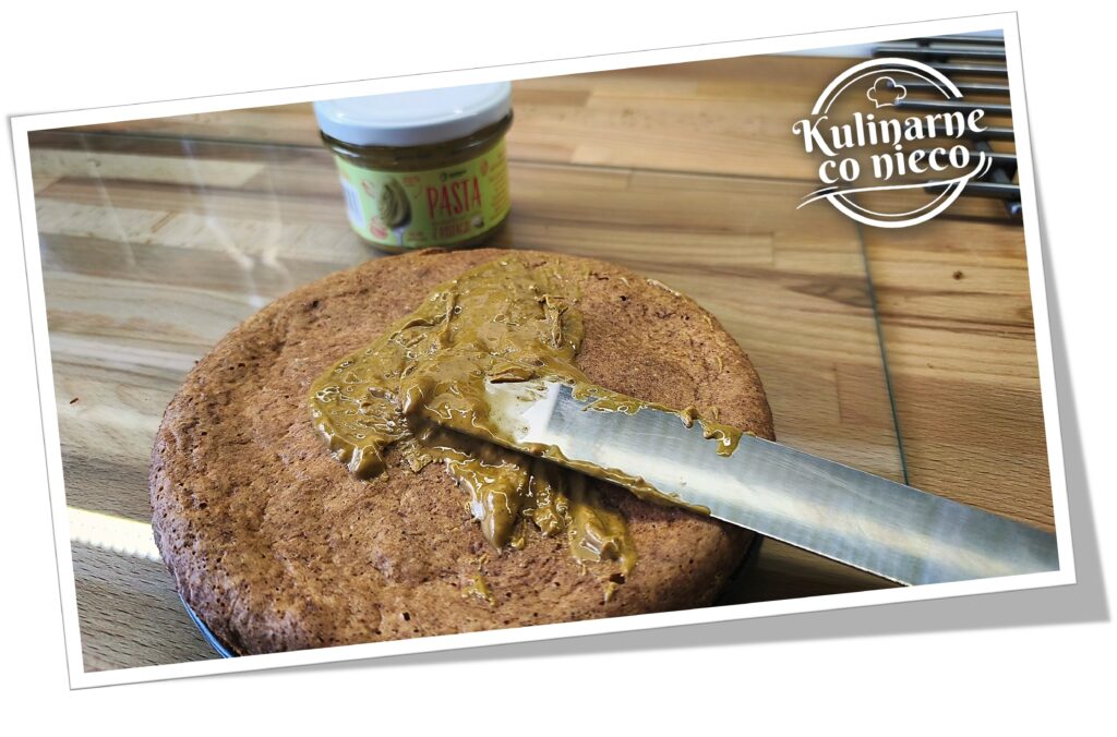 Wystudzony blat marchewkowy ułożyć na dnie tortownicy, w której był pieczony. Wierzch równomiernie posmarować pastą pistacjową (około 1½ łyżki). Zabieg ten nie tylko wzbogaca smak o delikatną, orzechową nutę, ale również pomaga lepiej połączyć obie warstwy deseru.
