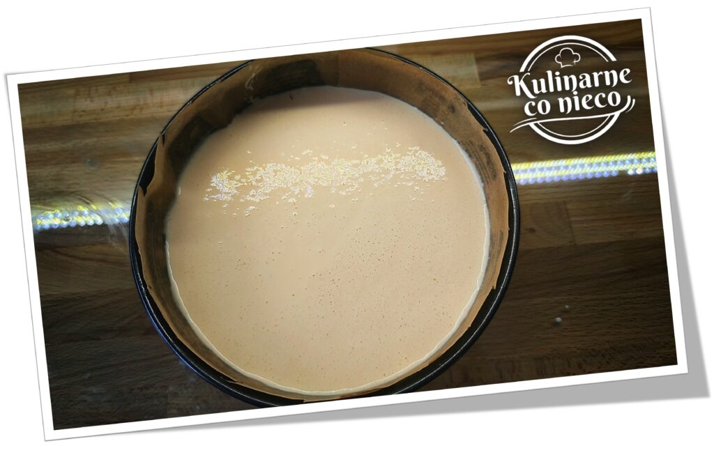 Masę przelać do tortownicy. Powierzchnię delikatnie wyrównać. Ewentualnie uderzyć tortownicą o blat kilka razy, aby usunąć nadmiar powietrza.