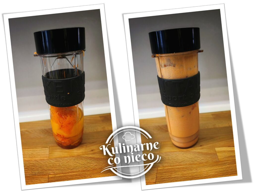 Marchew obrać, zetrzeć na drobnych oczkach tarki a następnie lekko odcisnąć z nadmiaru soku. Tak przygotowaną marchew przełożyć do blendera kielichowego, dodać jajka i zmiksować na gładki, jednolity mus. Ten etap pozwala całkowicie pozbyć się struktury marchewki i uzyskać wyjątkowo kremową, jednolitą konsystencję masy serowej.