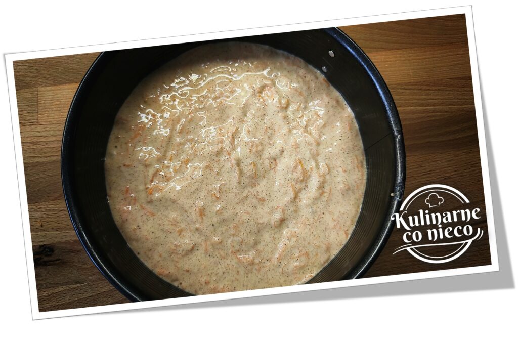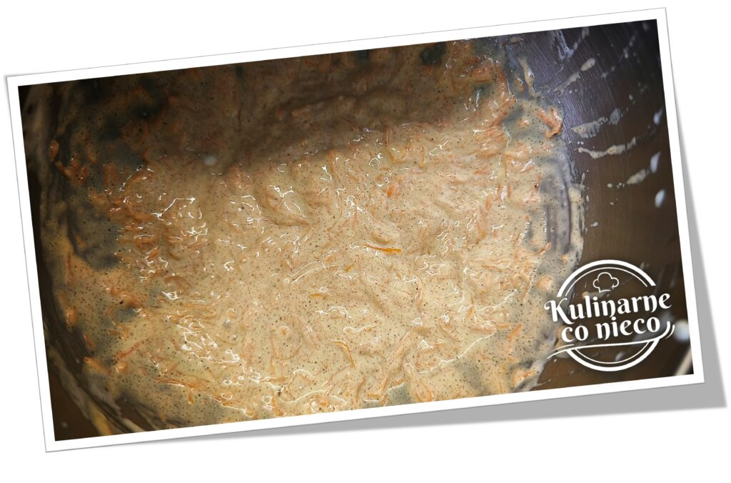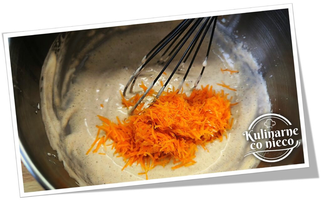 Suche składniki delikatnie wmieszać szpatułką do momentu uzyskania gładkiej, dość gęstej masy. Na końcu dodać startą marchewkę i delikatnie wmieszać ją, tak aby równomiernie rozprowadziła się w cieście.