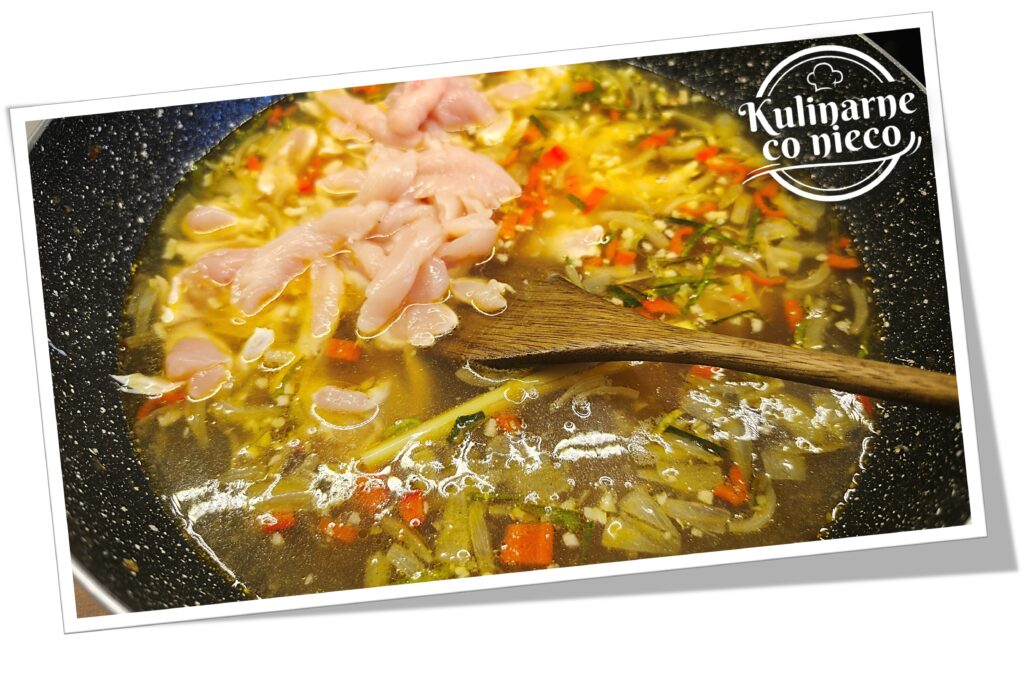 Gdy wywar zacznie lekko wrzeć dodać kurczaka i gotować na niewielkim ogniu przez około 8 minut, aż mięso stanie się miękkie i soczyste.