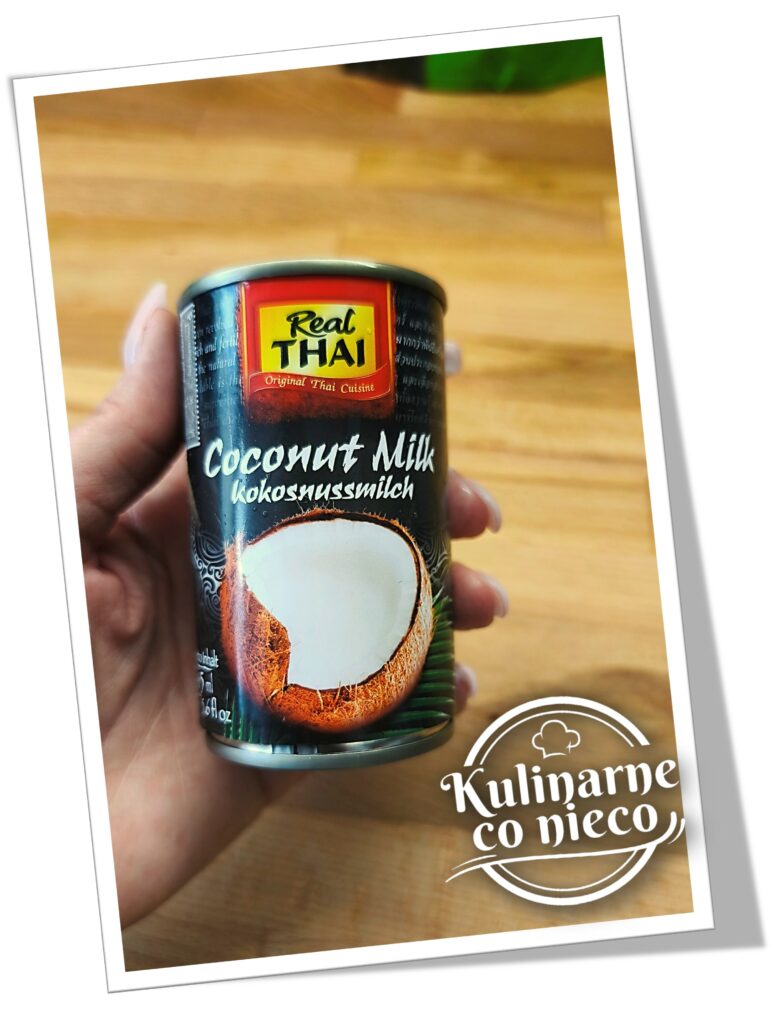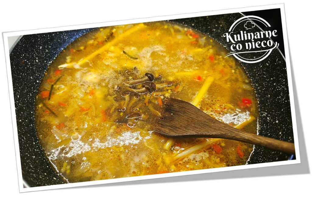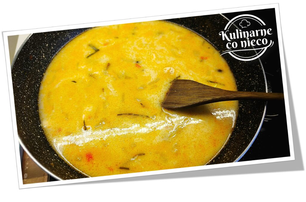 Do wywaru dodać połowę wcześniej podsmażonych grzybów oraz mleczko kokosowe (mleczko wcześniej dobrze wymieszać w puszce, aby połączyć gęstą i płynną część). Całość podgrzewać na małym ogniu, pilnując, aby nie doprowadzić do intensywnego wrzenia, ponieważ mleczko może się rozwarstwić. Na tym etapie zupa nabiera kremowej konsystencji i łagodniejszego, bardziej otulającego smaku.