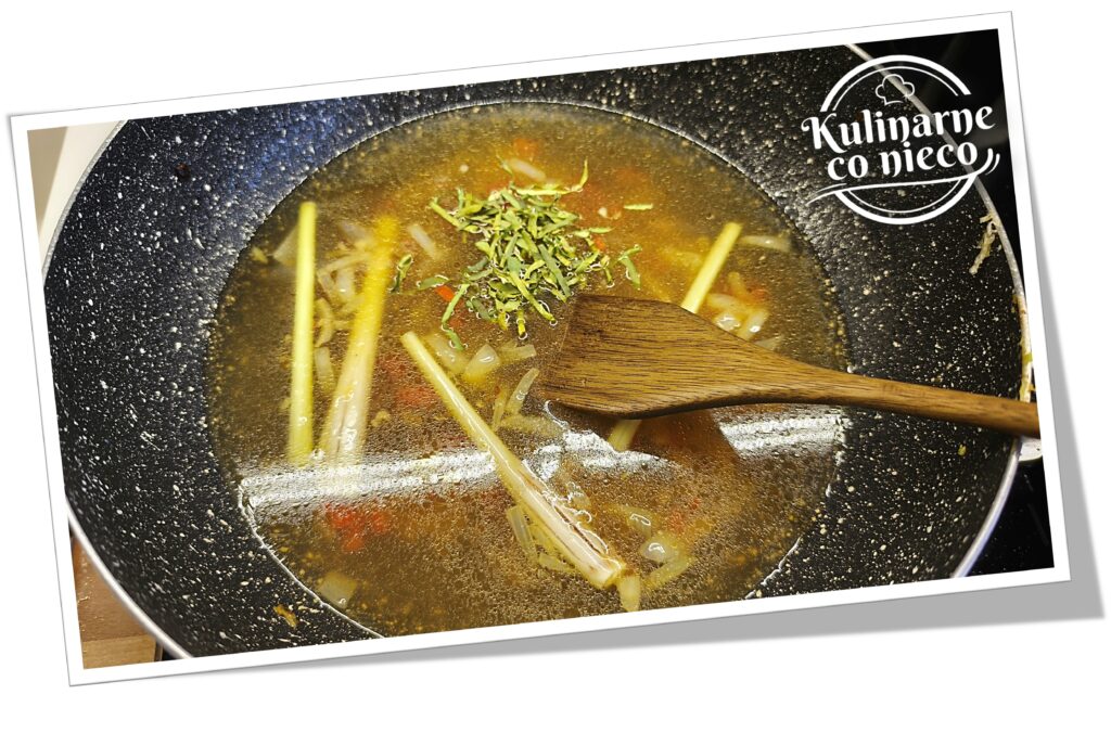 Wlać gorący bulion i dokładnie wymieszać, zbierając z dna wszystkie aromatyczne resztki. Dodać liście limonki kaffir, lekko je wcześniej zgniatając w dłoniach, aby oddały swój charakterystyczny aromat. Gotować całość kilka minut na umiarkowanym ogniu, aby smaki się połączyły i stworzyły wyrazistą bazę.